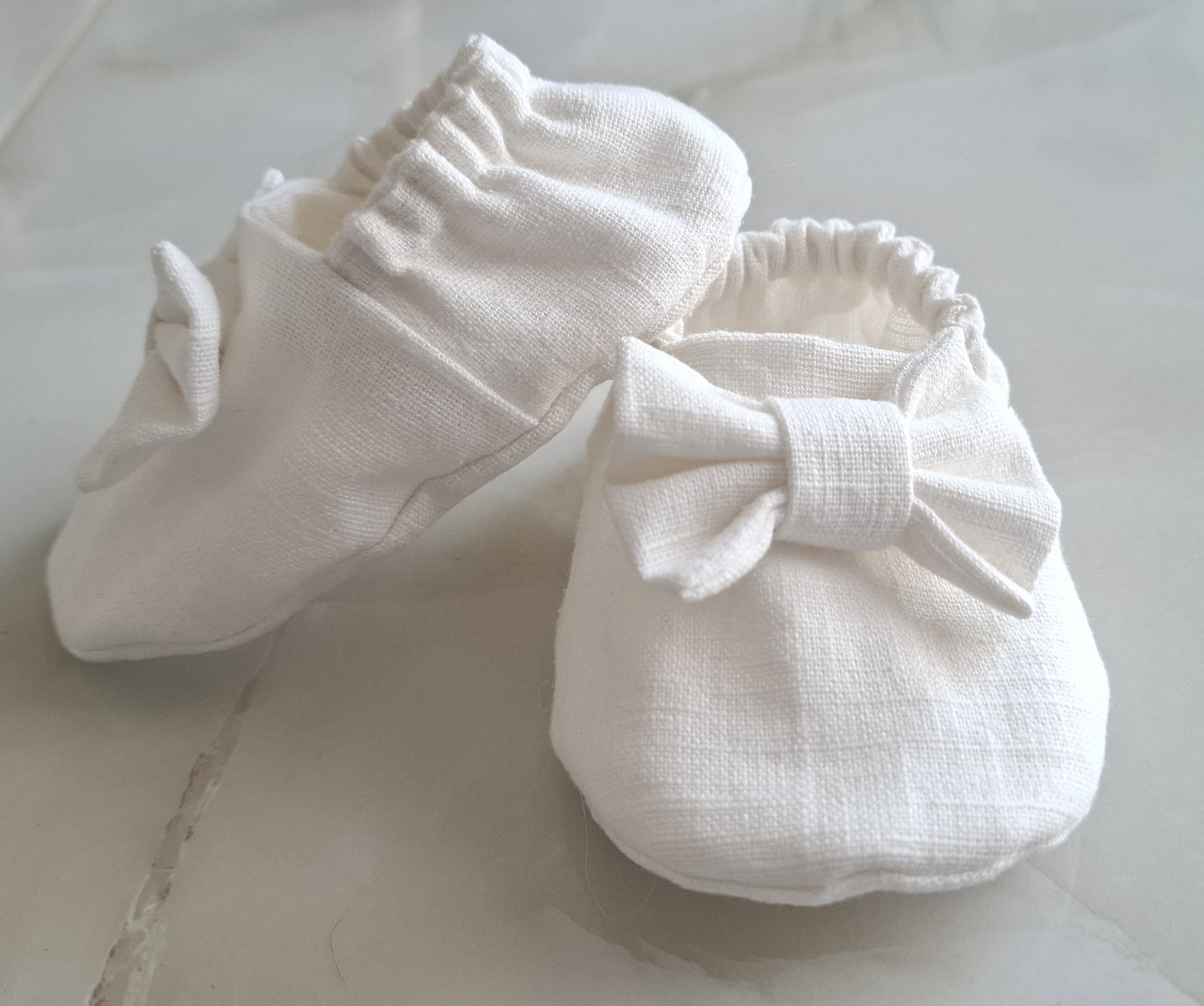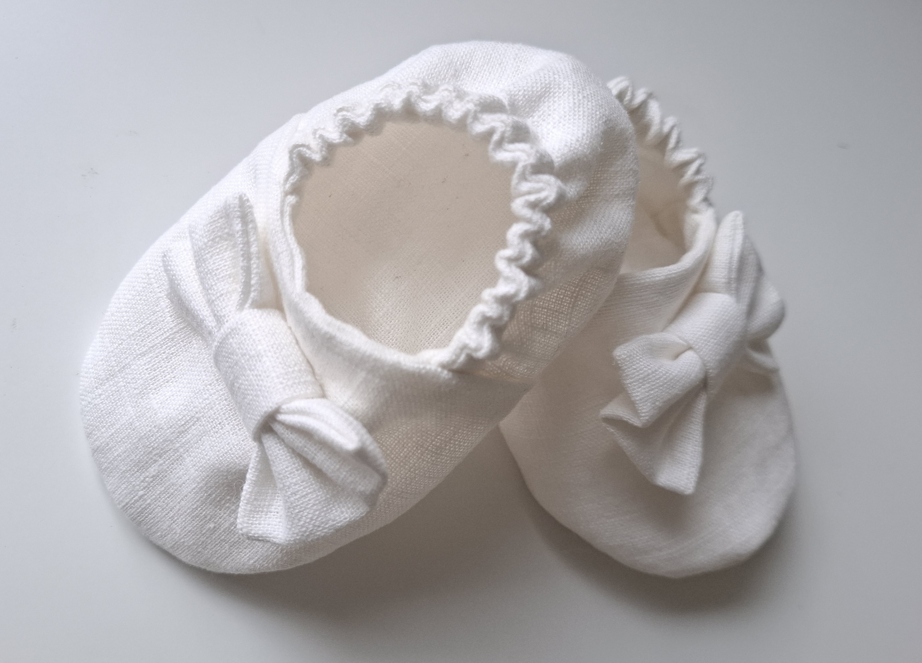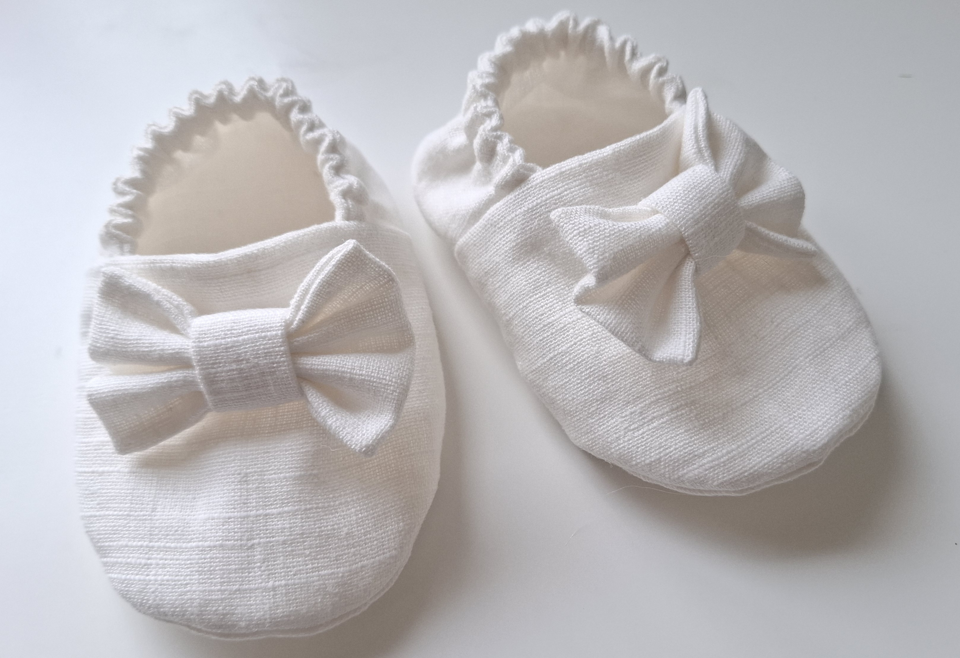 Balti lininiai rankų darbo minkšti bateliai su žavingu kaspinėliu puikiai užbaigią šventinį įvaizdį!