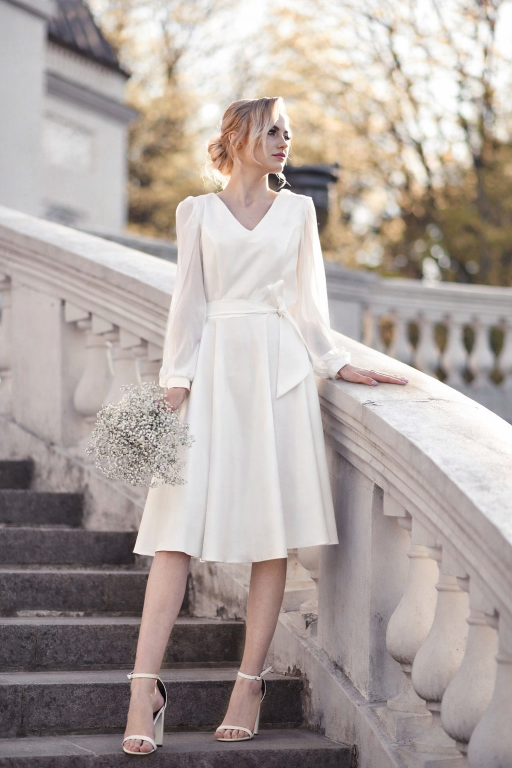 Klasikinė minimalistinė balta proginė suknelė KRETA ilgomis pūstomis šifono rankovėmis.