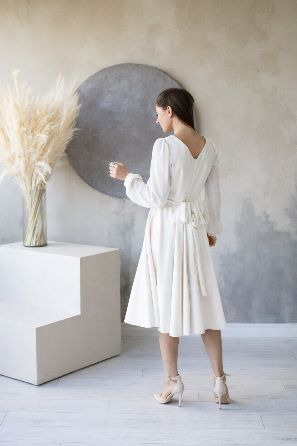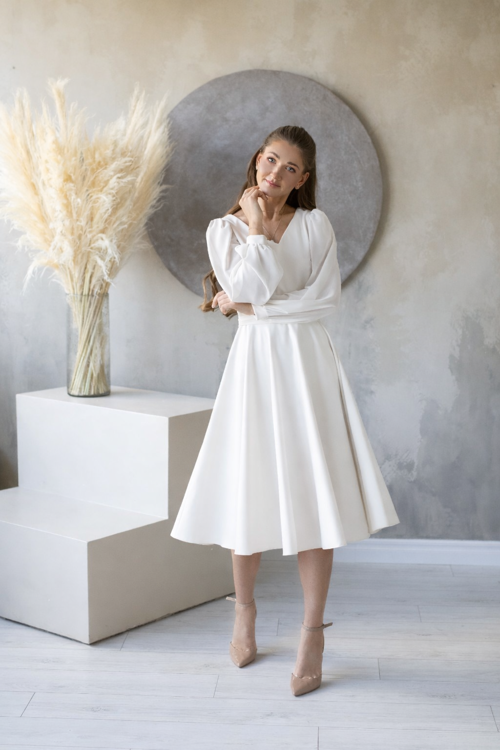 Klasikinė minimalistinė proginė suknelė KRETA ilgomis pūstomis šifono rankovėmis.