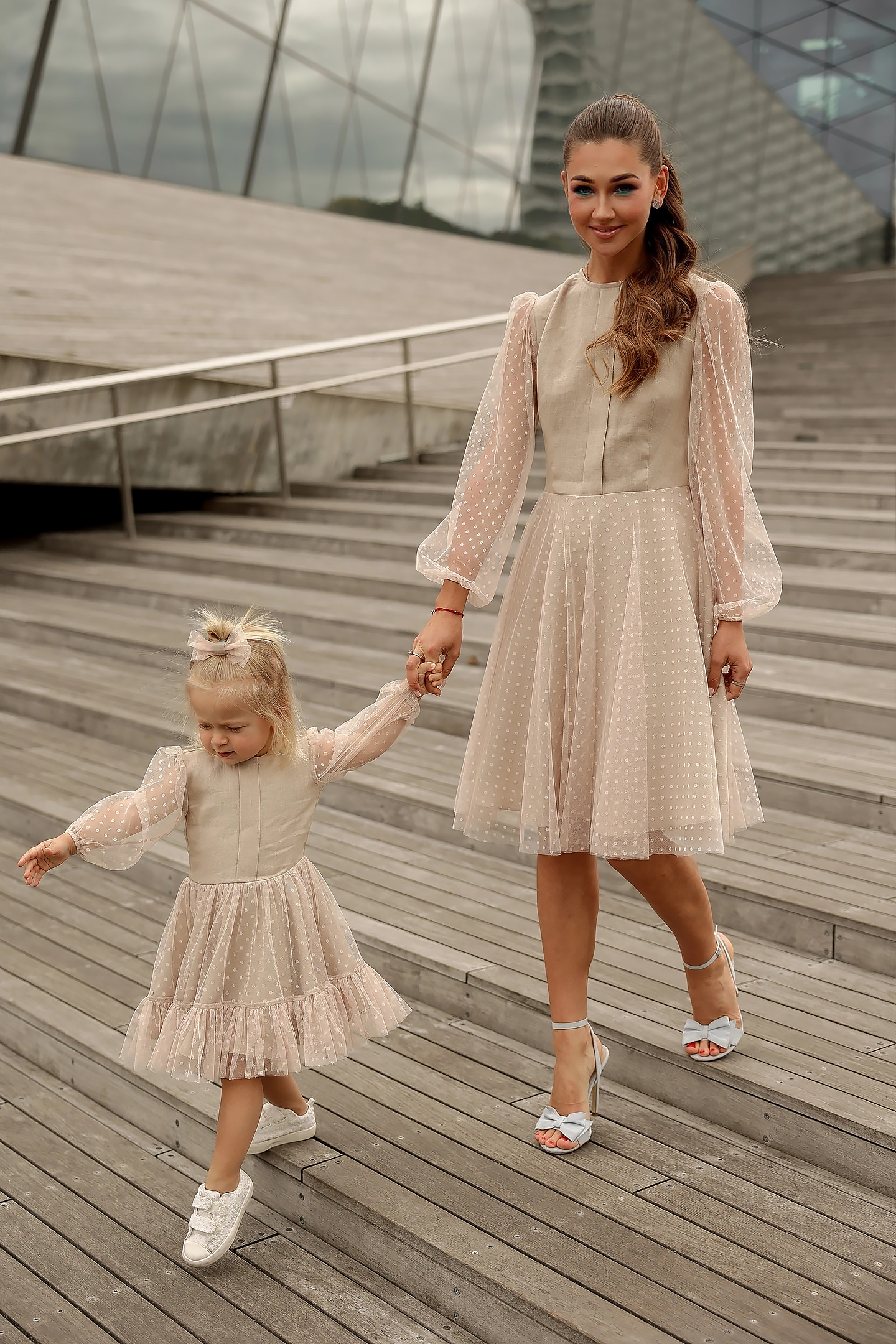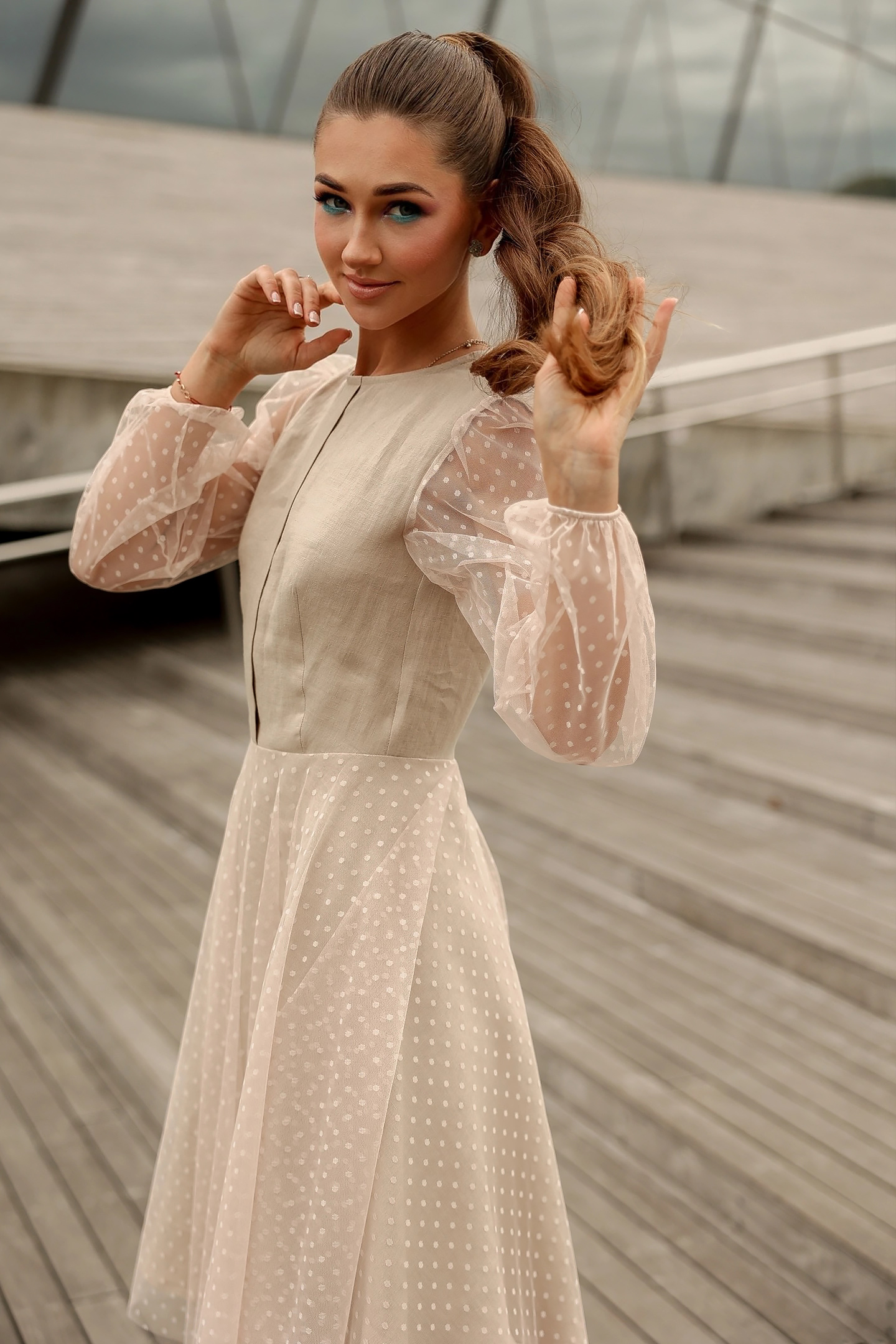 Itin romantiška kūno spalvos suknelė MILANA sukūrta iš kūno spalvos viskozės ir švelnaus taškuoto tiulio! Puikiai tiks Krikštynoms arba kuklioms vestuvėms.